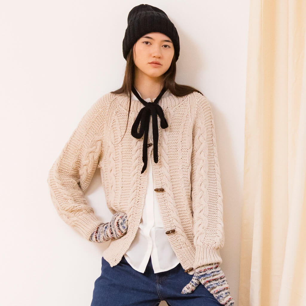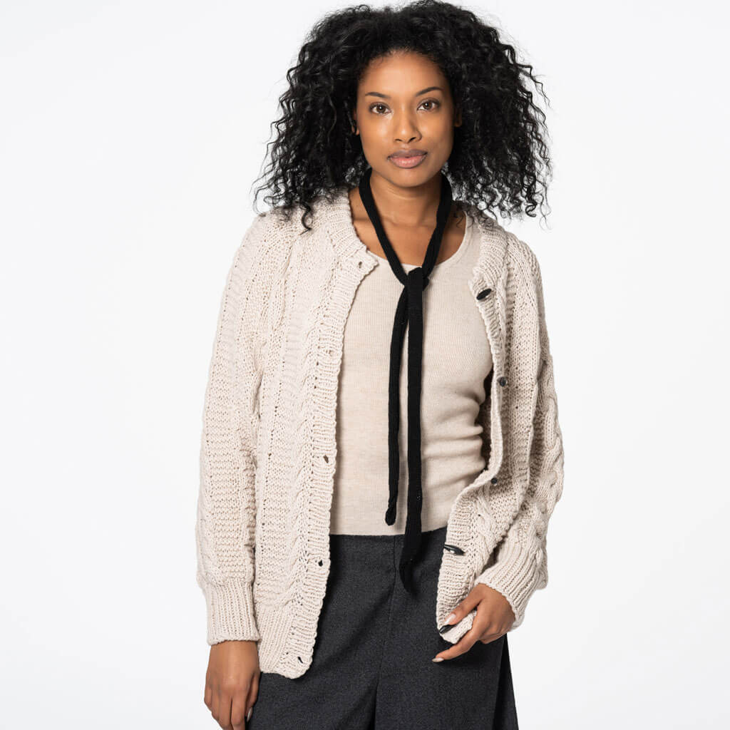 This chunky soft hand-knit cable knit cardigan sweater features vertical cables down the front, sleeves, and back. Finished with raglan sleeves, ribbed cuffs, and handmade horn buttons. A classic style that can be cherished and worn for years to come. This cable-knit sweater is made with extra-fine, mulesing-free Merino wool, which means it has zero-itch and is luxuriously cozy.