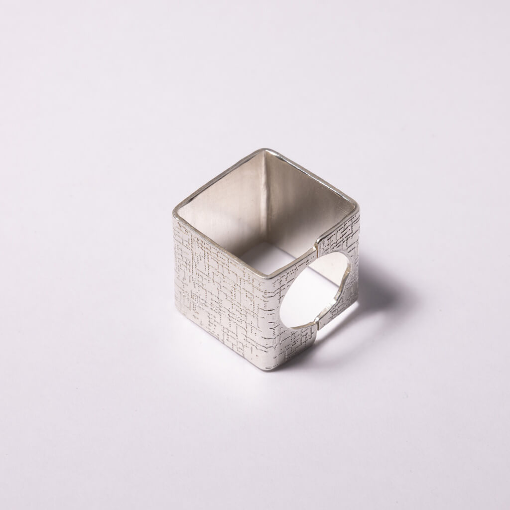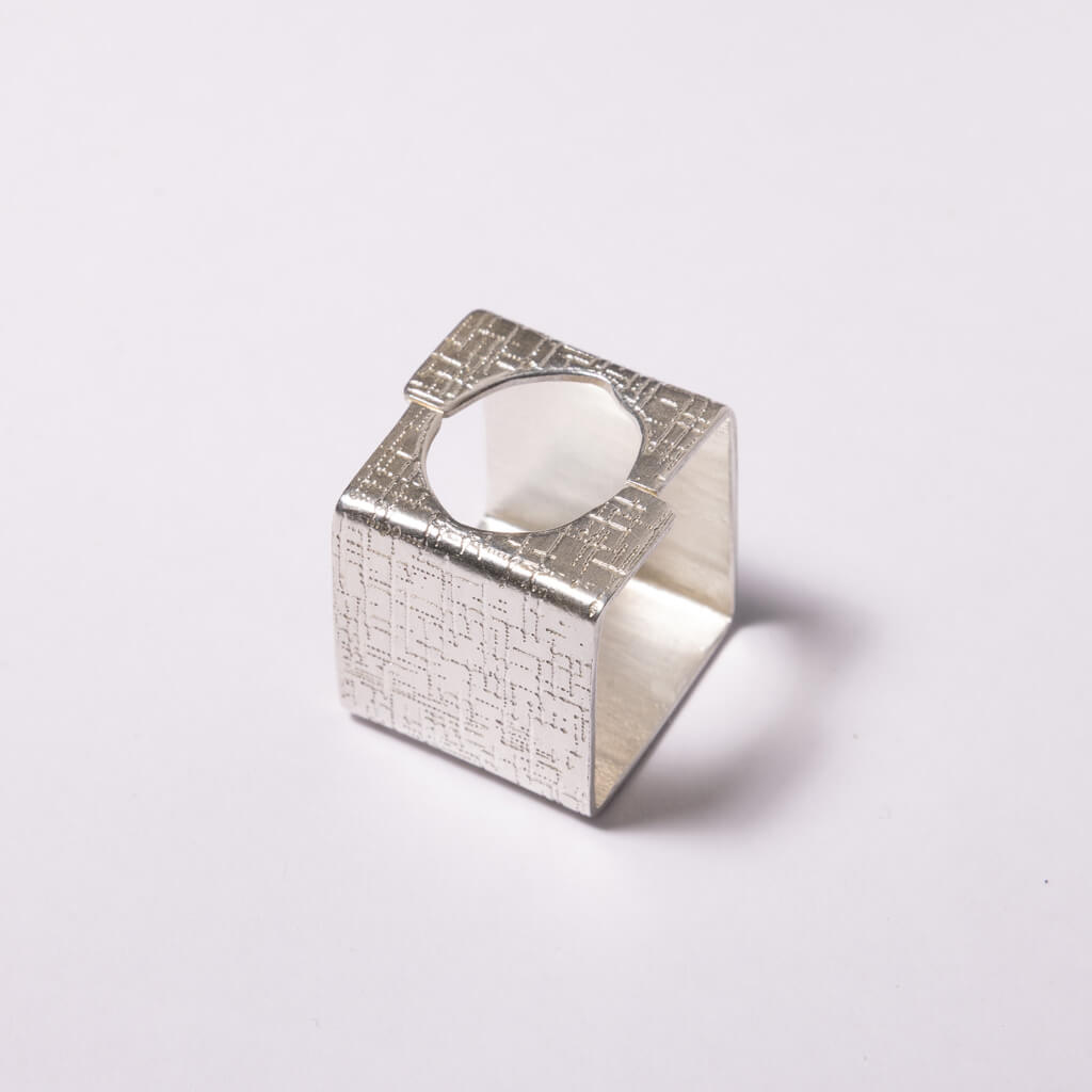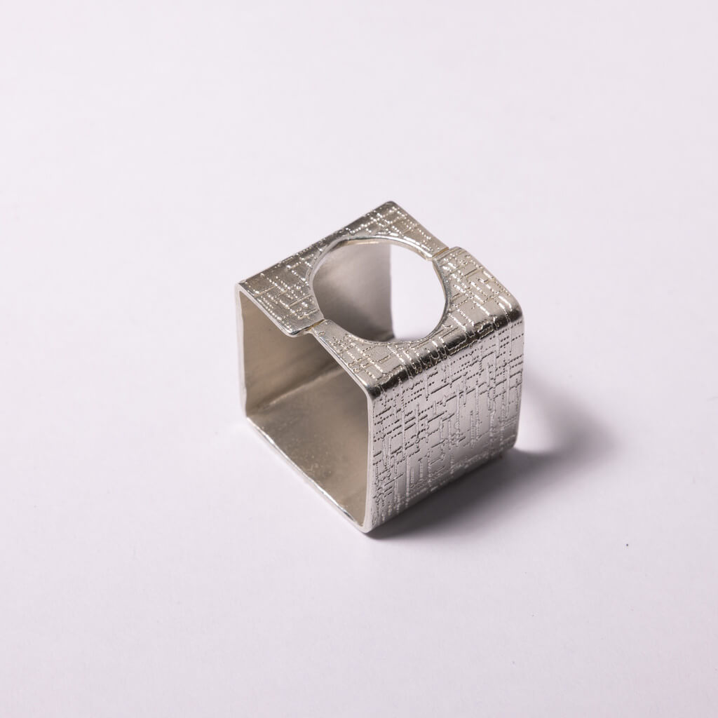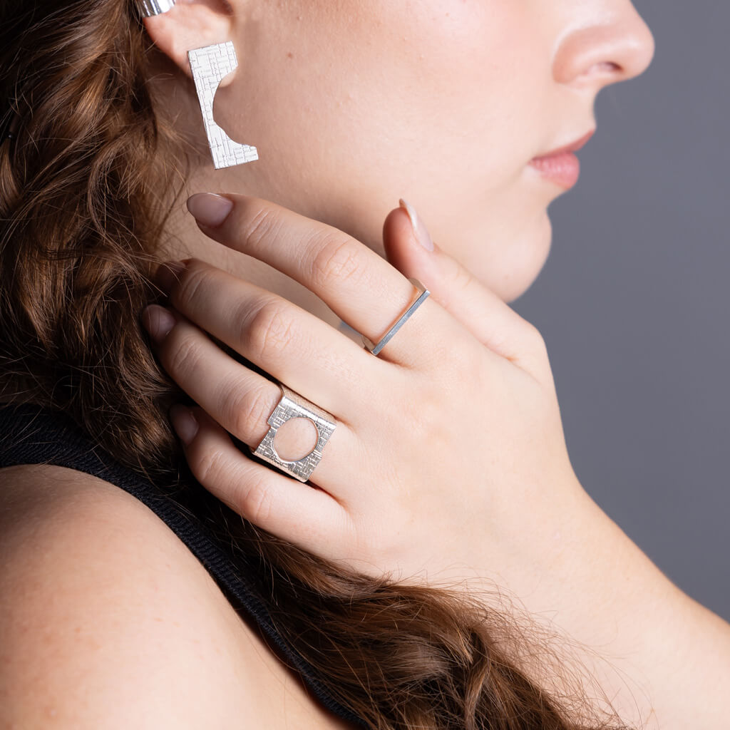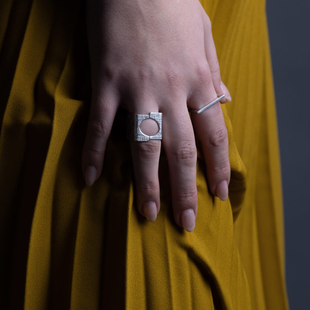 The Hatch ring merges mid-century modern geometry with contemporary design through its adjustable square form. Hand forged by Nepalese artisans using traditional techniques, the adjustable sizing accommodates varying finger widths. A refined piece for collectors valuing enduring style.