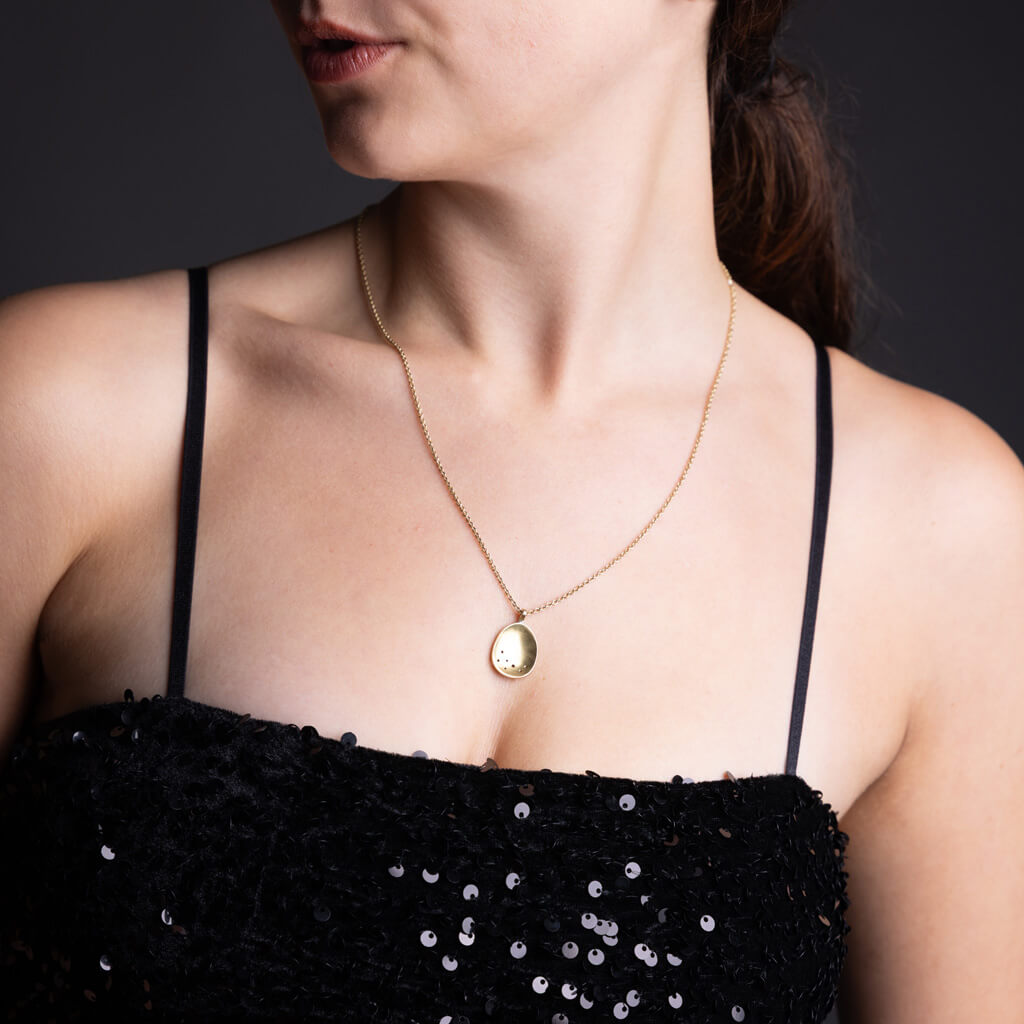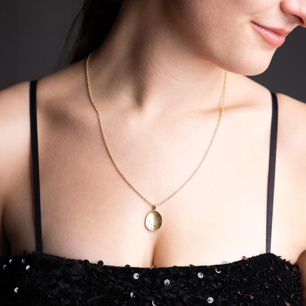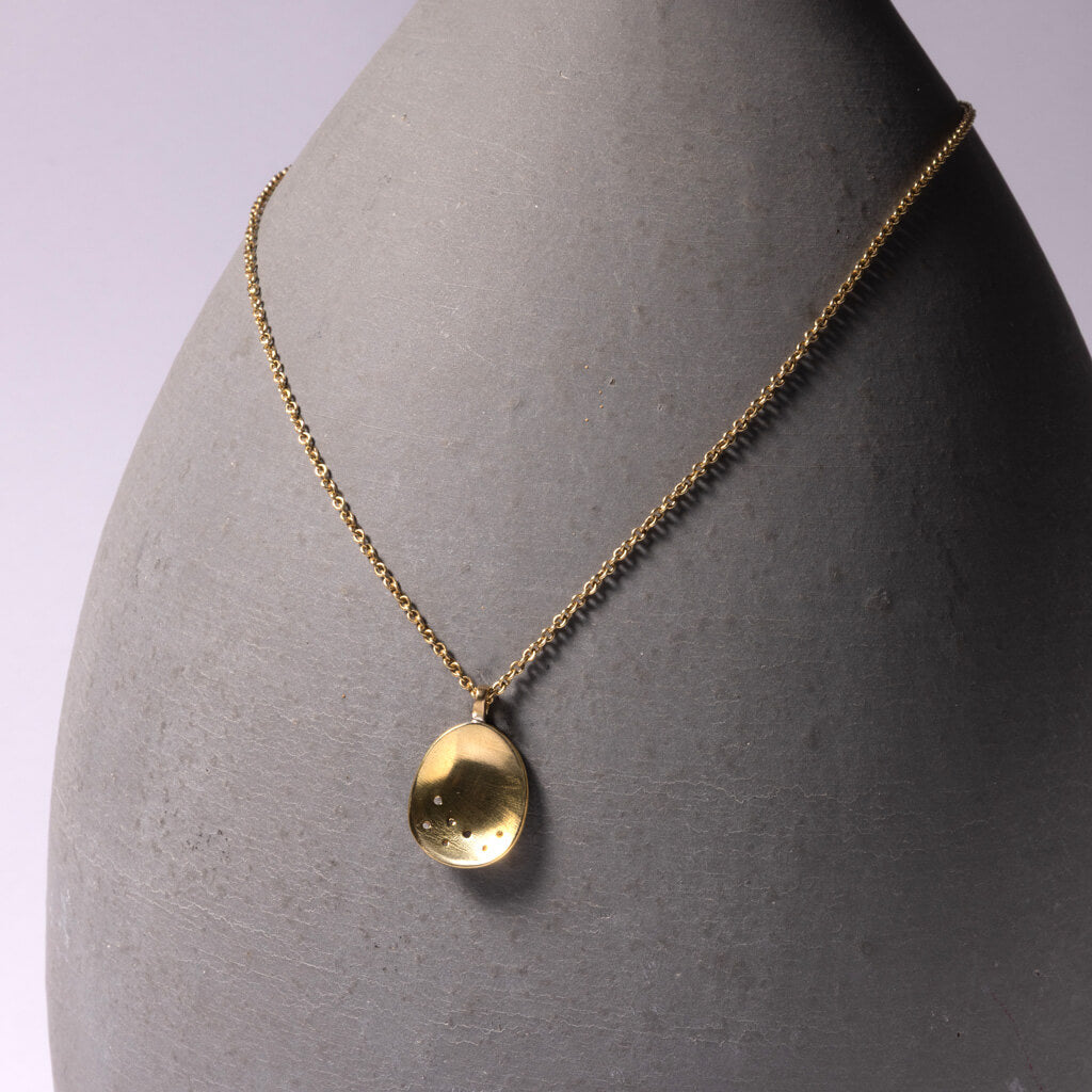 This refined brass charm embodies the essence of beginnings. Its smooth, concave form reflects light, evoking the celestial Himalayan skies. It serves as a meaningful talisman for new chapters. The minimalist design pairs beautifully as a standalone piece or layered alongside other pieces in our Moon or Origin Collections.