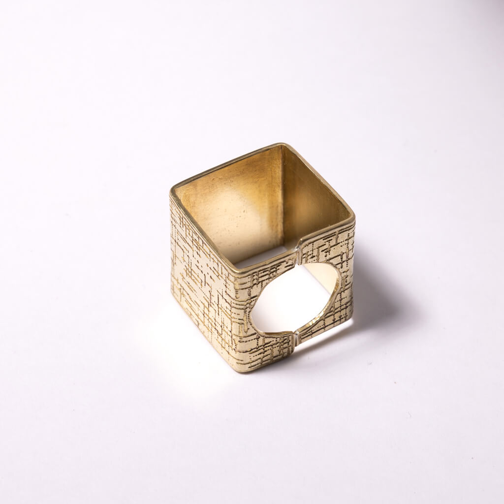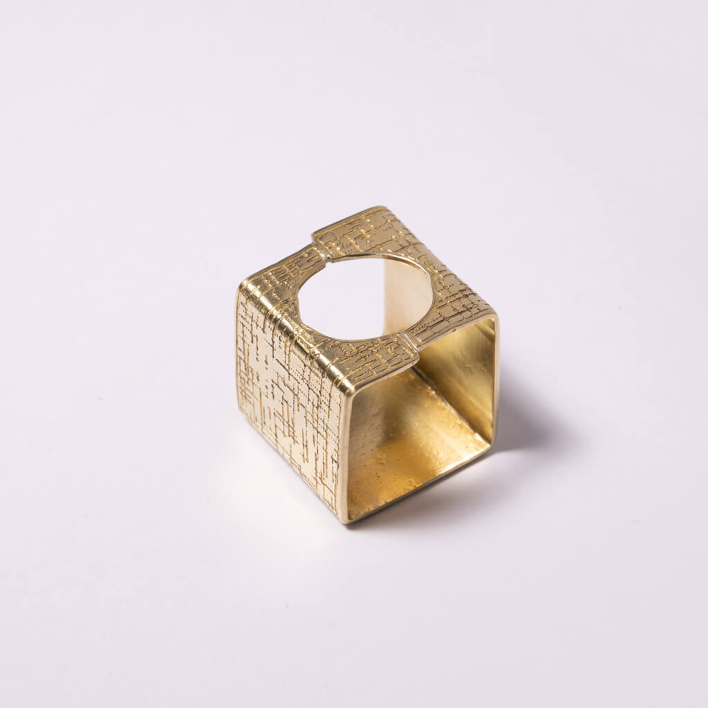 The Hatch ring merges mid-century modern geometry with contemporary design through its adjustable square form. Hand forged by Nepalese artisans using traditional techniques, the adjustable sizing accommodates varying finger widths. Brass develops a rich patina with wear, creating an evolving finish that authenticates its handmade craftsmanship. A refined piece for collectors valuing enduring style.