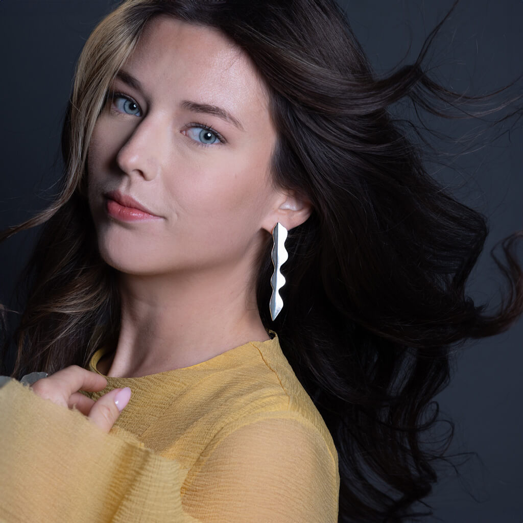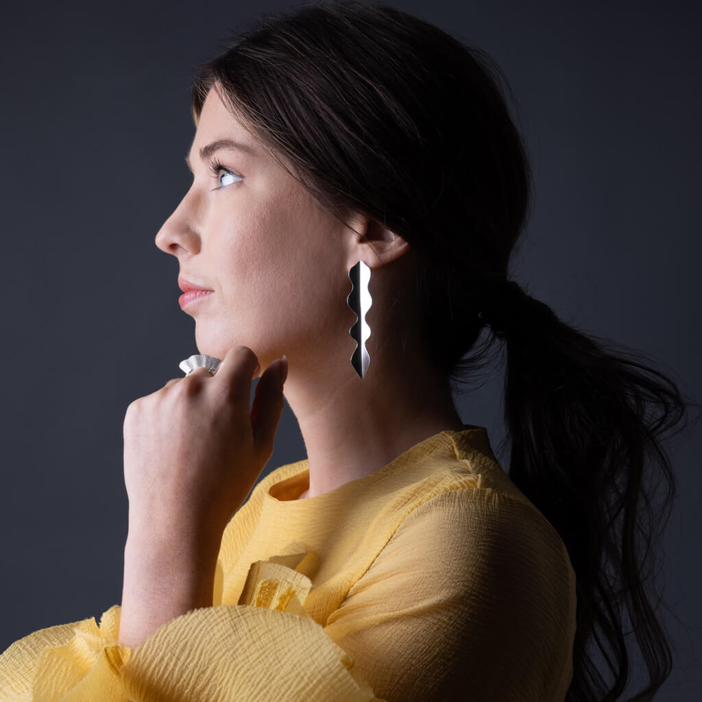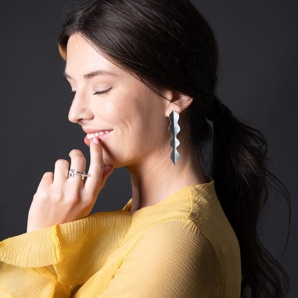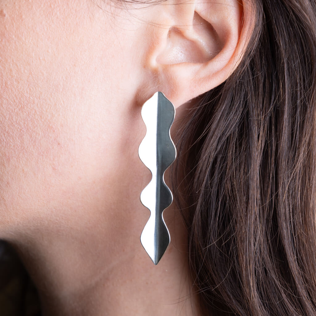 Our striking Wisteria Statement Earrings feature flowing, sculptural lines that catch and dance with light where organic curves meet contemporary edge. Handcrafted in sterling silver, these earrings are a bold silhouette paired with gentle strength.