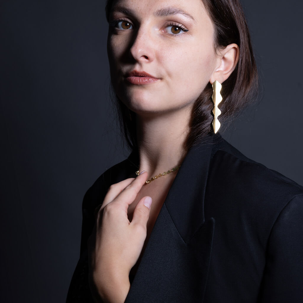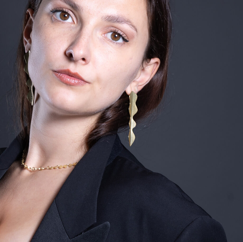 Our striking Wisteria Statement Earrings feature flowing, sculptural lines that catch and dance with light where organic curves meet contemporary edge. Handcrafted in brass, these earrings are a bold silhouette paired with gentle strength.